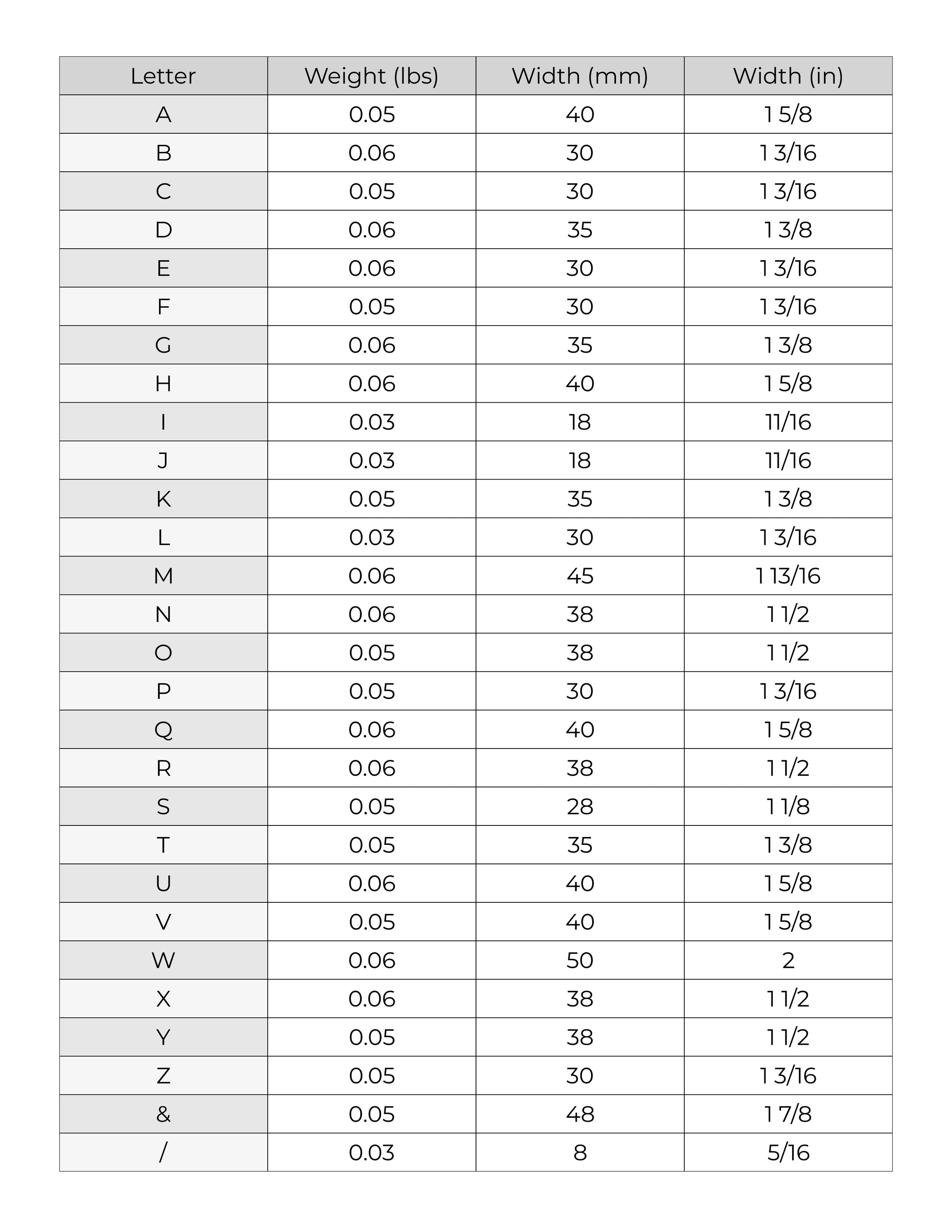 | Size Variant | Height (in) | Width (in) | Thickness (in) | Weight (lbs) |