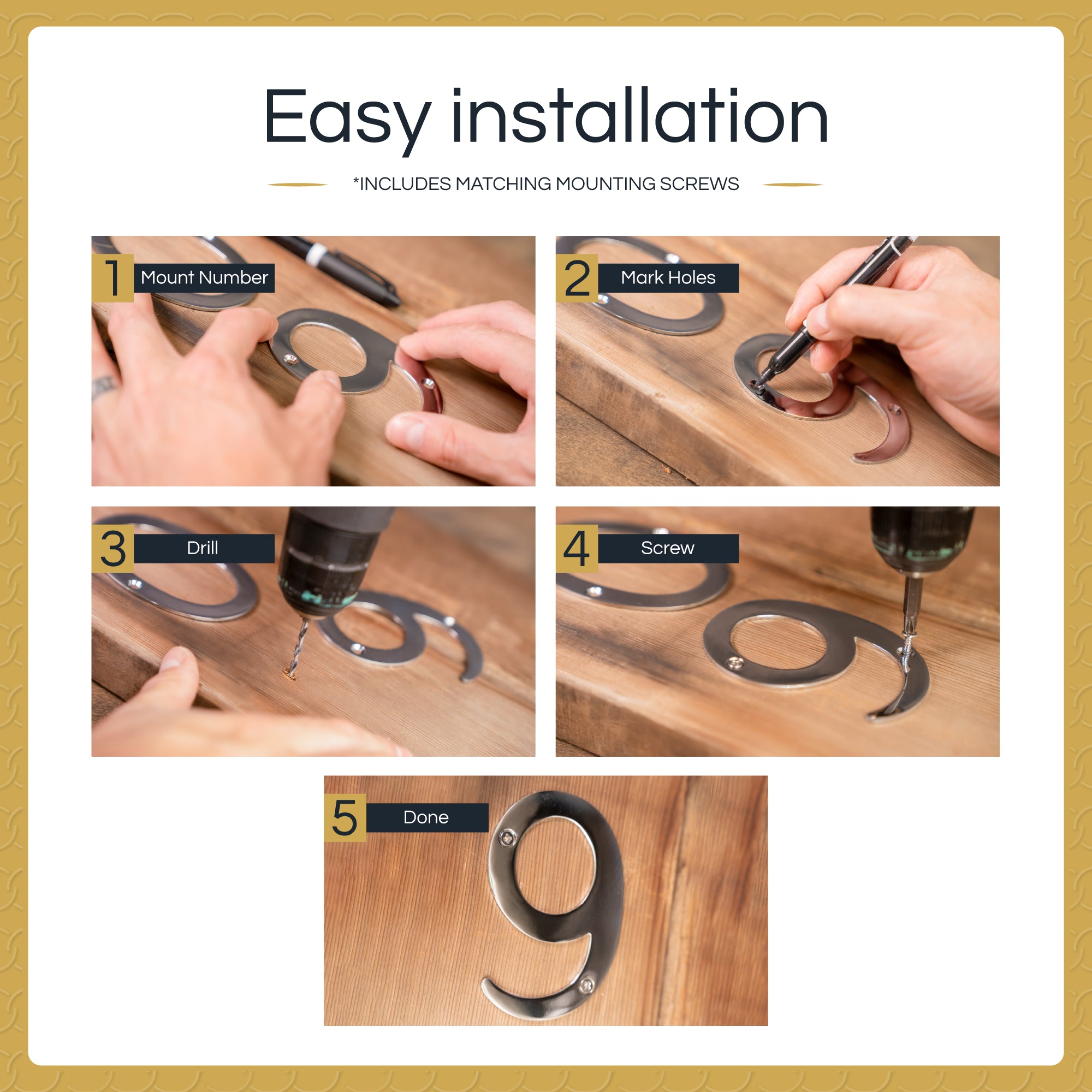 Easy to spot and easy to read! Our stylish 3-inch brass house numbers ensure that your house stands out on your block. Great choice for entry doors, house exterior, gates, mailboxes, porch columns, and mailbox posts, and love that they reduce the chance of missed deliveries and lost visitors. Mount these eye-catching numbers to any flat surface vertically, horizontally, angled, staggered, or however you like to reflect your own unique style! Installation is quick and easy since they arrive with matching rust-resistant screws that won't erode regardless of the environment - so they will look just as good as the day you received them for years to come. NOTE: While a power drill is necessary for drilling pilot holes where you want to install these numbers, in order to avoid stripping the enclosed matching screws, we strongly recommend using a phillips head screwdriver to install these numbers by hand, rather than a power drill.